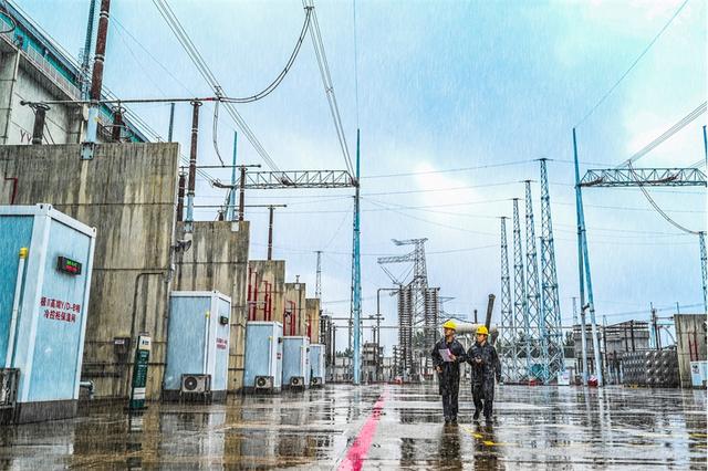 國網(wǎng)河南直流中心運(yùn)維人員在±800千伏特高壓中州換流站開展暴雨天氣特巡。