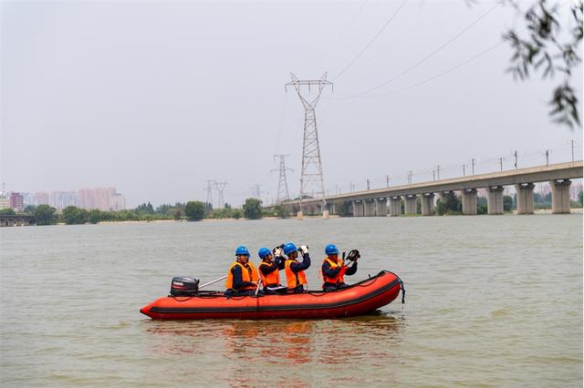 國網(wǎng)遼寧盤錦供電公司員工在繞陽河駕駛沖鋒舟開展防汛保電線路特巡。