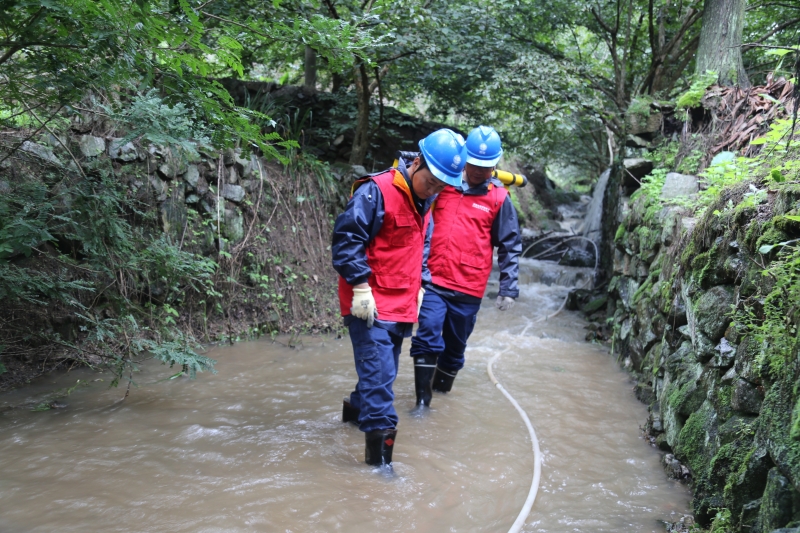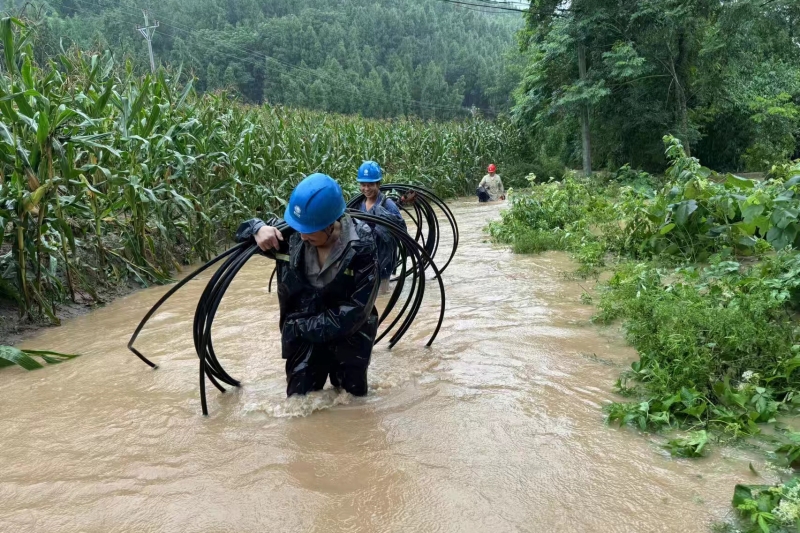 國(guó)網(wǎng)重慶開州供電公司員工蹚水前往巫山鎮(zhèn)處理10千伏鐵上線故障。