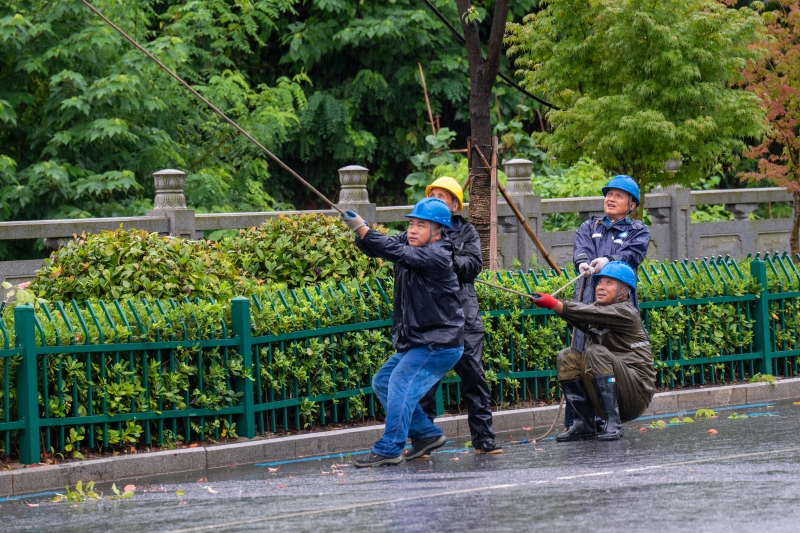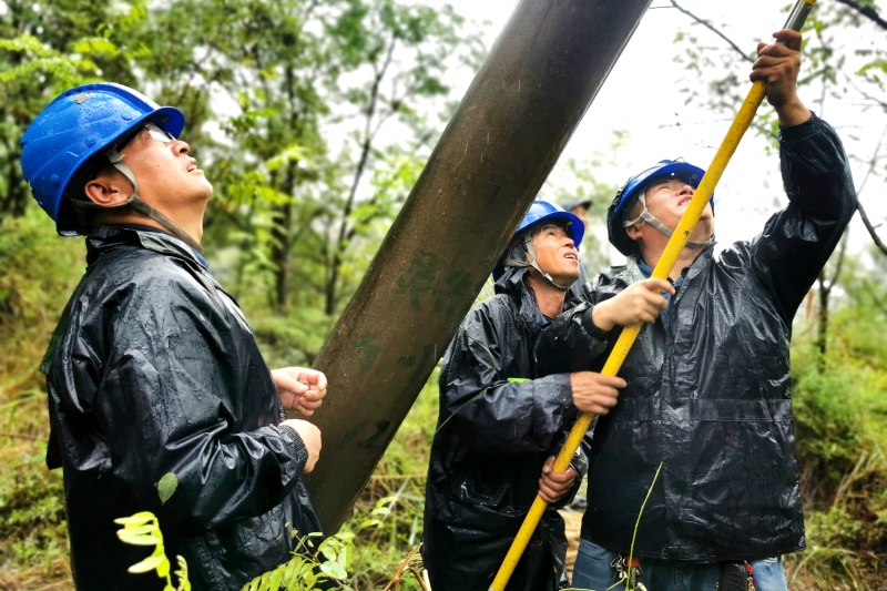 國(guó)網(wǎng)安徽蕪湖供電公司員工冒雨搶修因雷擊發(fā)生故障的10千伏渡江線。