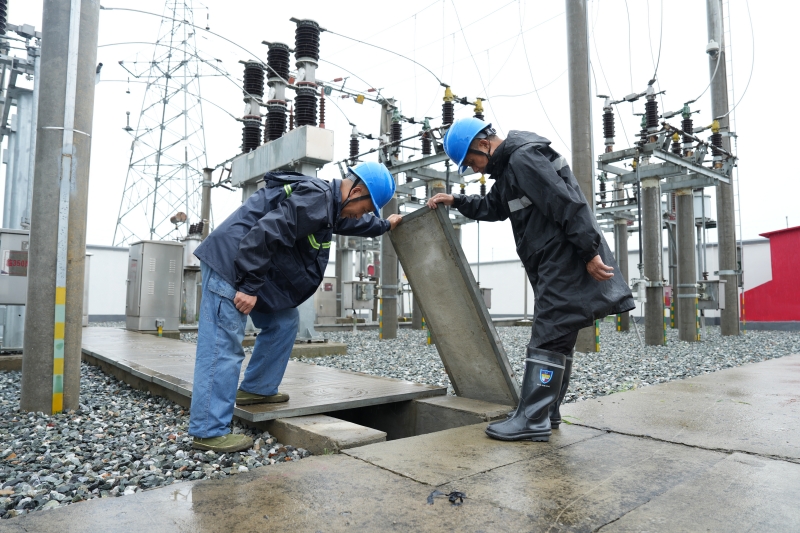 國(guó)網(wǎng)河南信陽供電公司員工在35千伏臨河變電站開展防汛特巡。