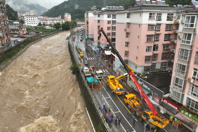 國(guó)網(wǎng)陜西寶雞供電公司員工為受汛情影響小區(qū)接通發(fā)電車。