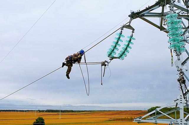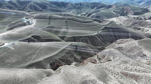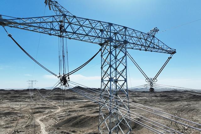 國網甘肅電力施工人員在哈密—重慶±800千伏特高壓直流輸電工程開展架線自檢。
