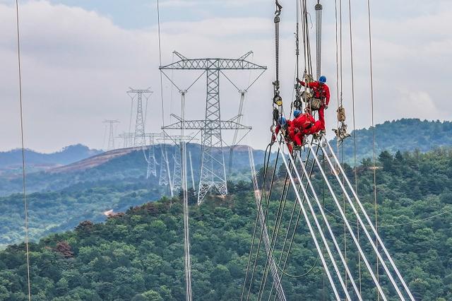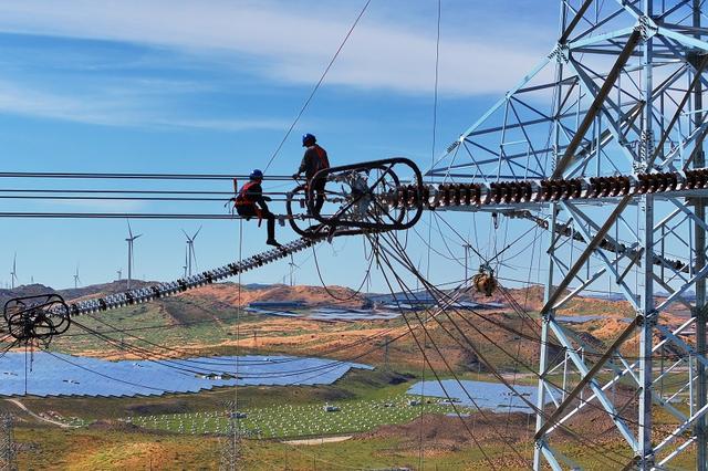 國網寧夏送變電公司施工人員在寧夏—湖南±800千伏特高壓直流輸電工程進行平衡掛線作業(yè)。
