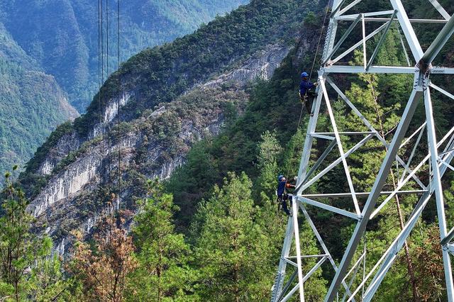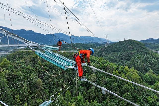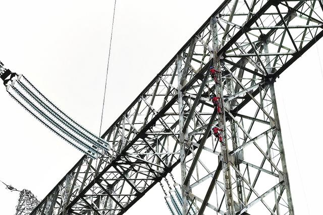 國網重慶送變電公司施工人員在寧夏—湖南±800千伏特高壓直流輸電線路工程登塔作業(yè)。
