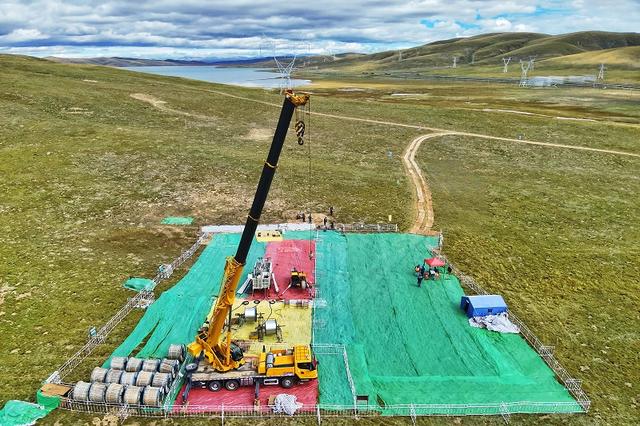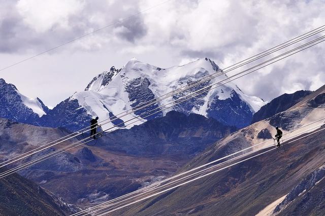 國網青海送變電公司施工人員在玉樹II回330千伏線路工程展放導線。