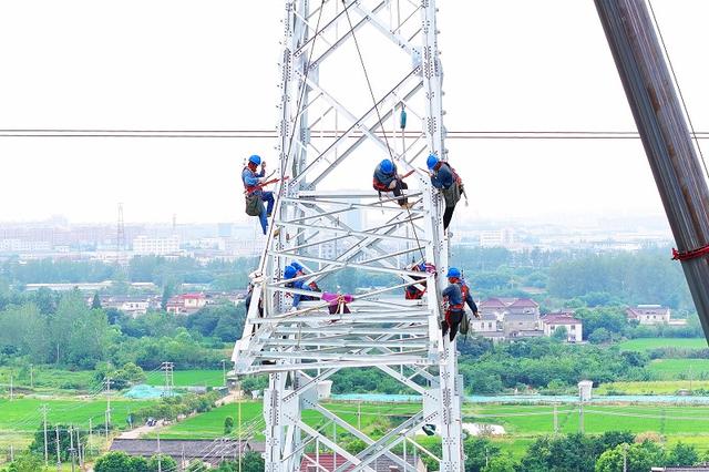 國網江蘇揚州供電公司施工人員在220千伏鳳蜀線路工程立塔作業(yè)。