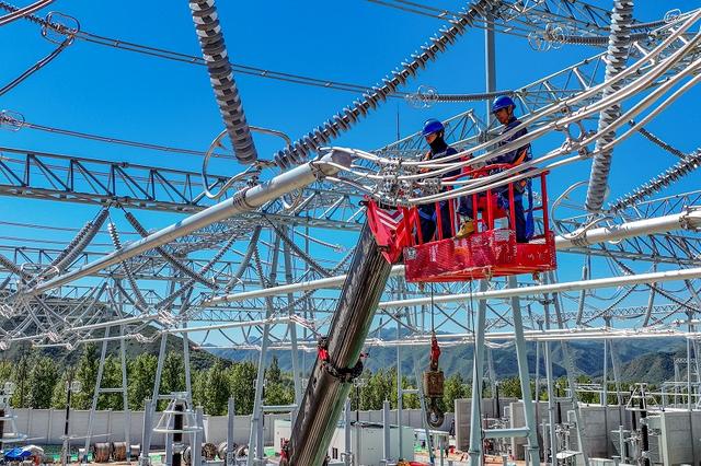 國網北京送變電有限公司施工人員在牌樓500千伏變電站新建工程現場安裝500千伏管母線跳線。