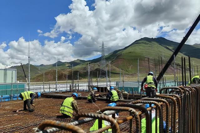 國網河南送變電建設有限公司施工人員在青藏聯網二期工程±400千伏拉薩換流站開展鋼筋綁扎作業(yè)。