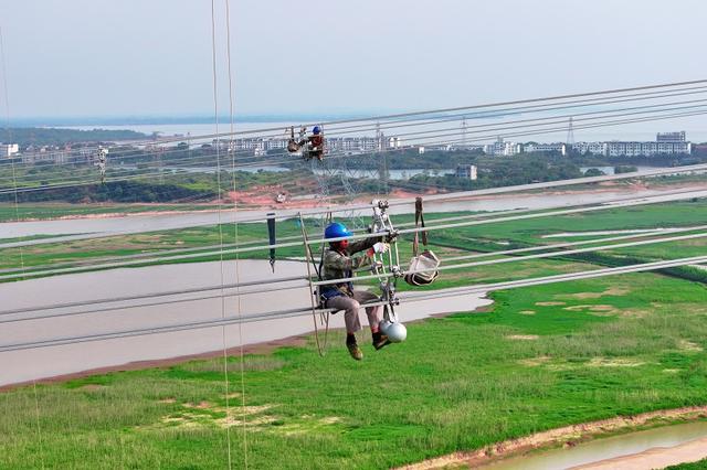 國網江西電力建設公司施工人員在武漢—南昌1000千伏雙回線路工程安裝間隔棒。