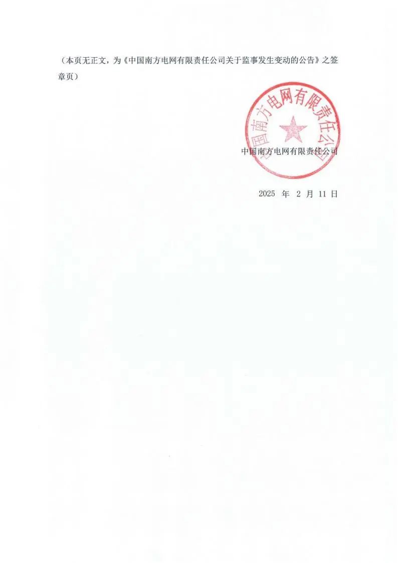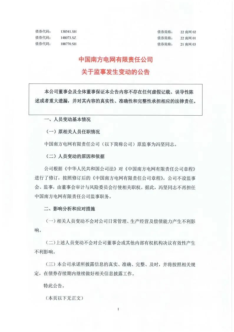 2月11日,中國南方電網(wǎng)有限責(zé)任公司發(fā)布關(guān)于監(jiān)事發(fā)生變動的公告。公司根據(jù)《中華人民共和國公司法》對《中國南方電網(wǎng)有限責(zé)任公司章程》進行了修訂,按照修訂后的《中國南方電網(wǎng)有限責(zé)任公司章程》,公司不再設(shè)監(jiān)事會、監(jiān)事,由董事會審計與風(fēng)險委員會行使相關(guān)職權(quán)。據(jù)此,馮堅同志不再擔(dān)任中國南方電網(wǎng)有限責(zé)任公司監(jiān)事職務(wù)。