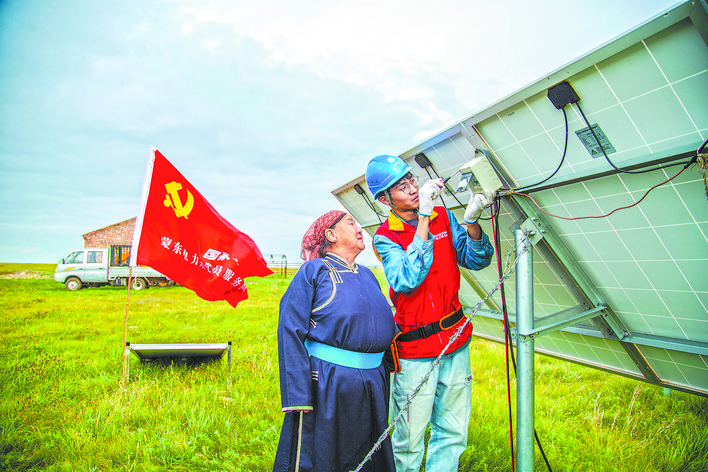 國家電網(wǎng)蒙東電力(呼倫貝爾新巴爾虎右旗)共產(chǎn)黨員服務(wù)隊(duì)隊(duì)員為牧民檢查光伏板。宋天培 攝