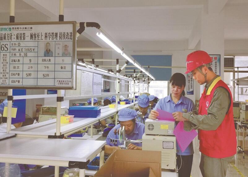 黨員服務隊隊員來到湖北榮浩電子有限公司,為流水線上的工人講解安全用電知識。程建僑 攝