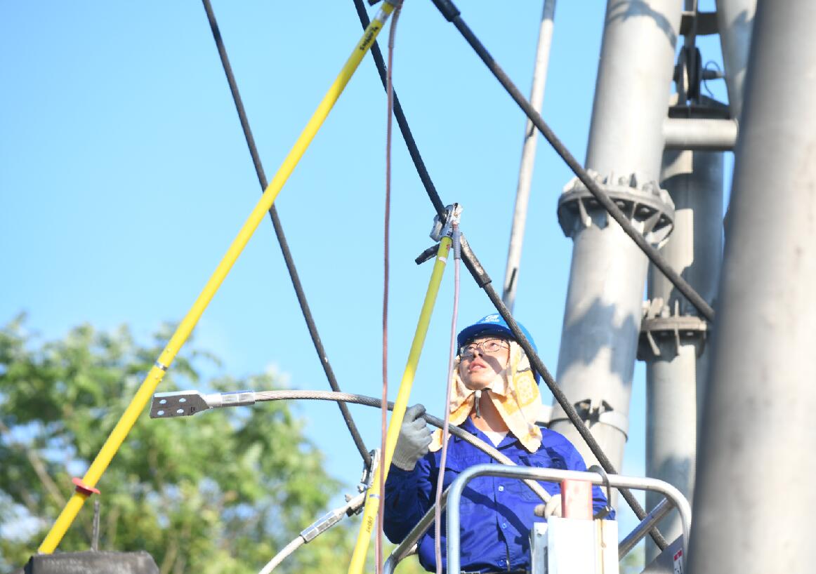 中國電力網(wǎng)訊 “在進(jìn)行線路閘刀維護(hù)工作前,一定要在線路閘刀線路側(cè)掛一副臨時接地線。”7月10日,在110千伏梁弄變檢修現(xiàn)場,國網(wǎng)余姚市供電公司變電運檢中心員工正迎著烈日進(jìn)行著變電站檢修工作。