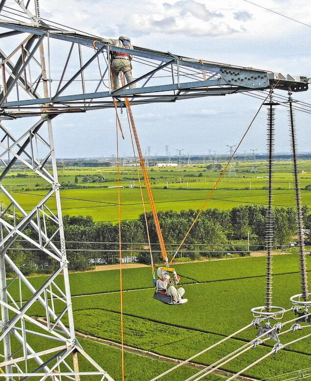 9月22日,國網(wǎng)江蘇超高壓公司輸電中心員工在位于江蘇泰州的500千伏泰城線開展等電位帶電作業(yè),消除鐵塔絕緣子脫銷缺陷,確保線路安全可靠運行。