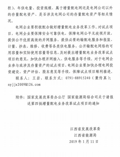江西省發(fā)改委、江西省能源局日前聯(lián)合發(fā)布了《關(guān)于報送第四批增量配電業(yè)務(wù)改革試點項目的通知》,要求各地要結(jié)合工作實際情況,認(rèn)真總結(jié)前三批試點經(jīng)驗,按照國家相關(guān)要求盡快篩選符合條件的第四批試點項目,試點項目應(yīng)符合省級電網(wǎng)規(guī)劃。強調(diào)電網(wǎng)企業(yè)要積極配合做好增量配電業(yè)務(wù)改革工作。對試點項目,電網(wǎng)企業(yè)要保障安全可靠供電,保障電網(wǎng)公平無歧視開放, 提供公平優(yōu)質(zhì)高效的并網(wǎng)服務(wù),提供必要的輸配電服務(wù)和報裝、 計量、抄表、維修、收費等各類供電服務(wù),公開輸配電網(wǎng)絡(luò)的可 用容量和實際使用容量等信息,及時提出增量配電業(yè)務(wù)改革試點項目的意見,加快辦理并網(wǎng)接入、供電服務(wù)等手續(xù)。