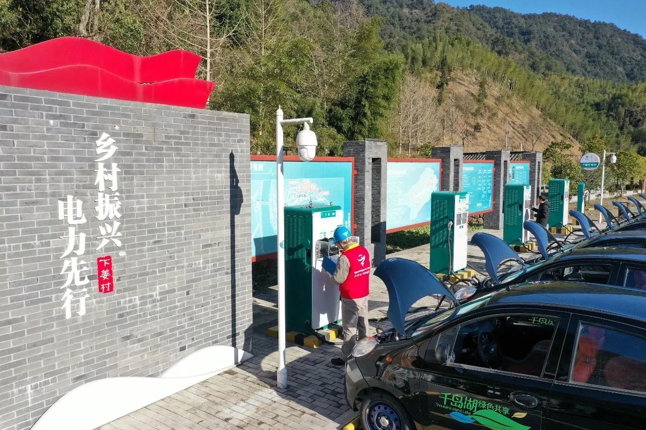 供電員工在杭州市下姜村檢查電動(dòng)汽車充電設(shè)施