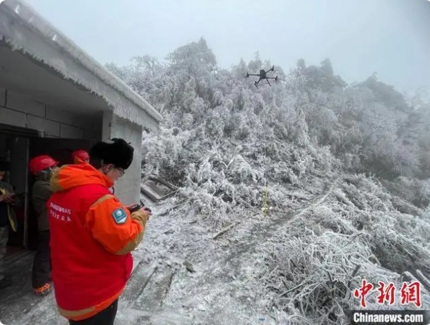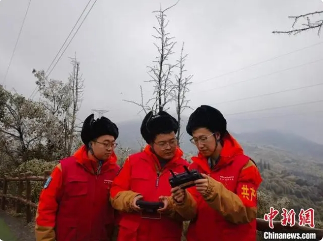 晉電援湘抗冰突擊隊(duì)隊(duì)員利用無人機(jī)觀察冰情。國(guó)網(wǎng)山西省電力公司供圖