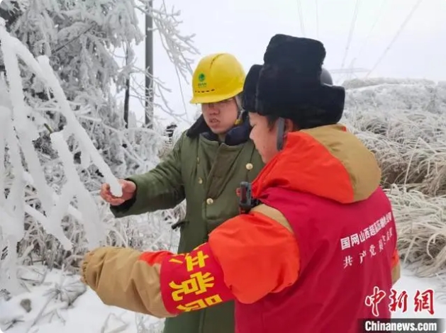 晉電援湘抗冰突擊隊(duì)隊(duì)員正在查看湖南電網(wǎng)線路周邊覆冰情況。國(guó)網(wǎng)山西省電力公司供圖