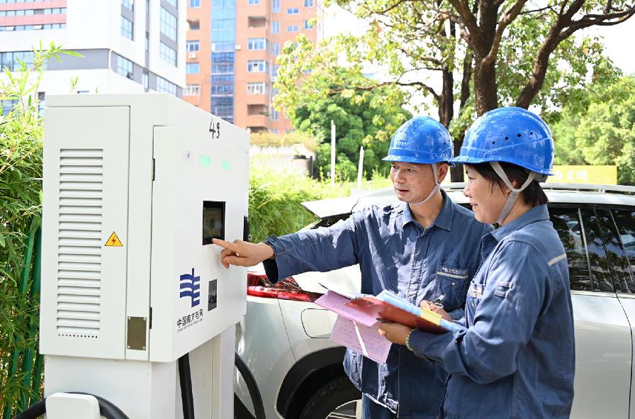 南方電網(wǎng)廣東佛山南海供電局工作人員正在檢查驗收充電樁設備