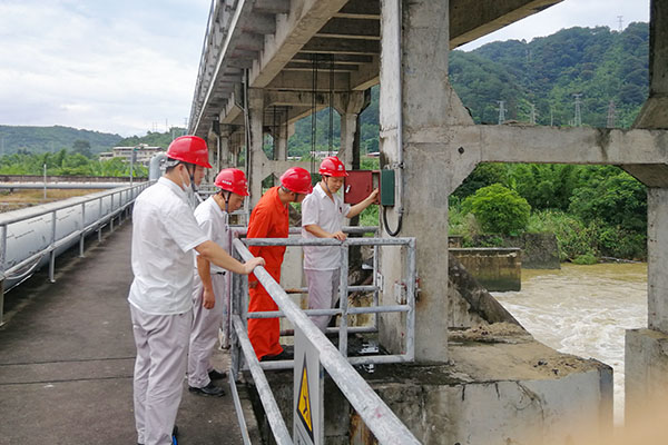 圖為檢查組正在檢查遠(yuǎn)程泵房水壩閘門
