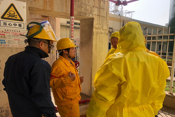 中國電力網(wǎng)訊 10月22日,南京化學(xué)工業(yè)園熱電有限公司(以下簡稱公司)開展二期水處理鹽酸儲(chǔ)罐本體泄漏的應(yīng)急演練,本次演練采用實(shí)戰(zhàn)演練方式進(jìn)行,發(fā)電部一期集控丙值運(yùn)行人員參加本次演練,化學(xué)人員進(jìn)行監(jiān)護(hù)。