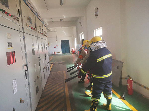 此次演練場(chǎng)景設(shè)置為模擬SVG連接變壓器341高壓開(kāi)關(guān)柜著火,共場(chǎng)景11個(gè)。在總指揮交代運(yùn)行方式、應(yīng)急組組長(zhǎng)進(jìn)行安全交底后,隨著生產(chǎn)樓辦公區(qū)域傳出刺耳的火警警報(bào)聲,演練正式開(kāi)始。煙感報(bào)警裝置發(fā)現(xiàn)火情,應(yīng)急組長(zhǎng)立即派人就地檢查發(fā)現(xiàn)341高壓開(kāi)關(guān)柜下部冒出濃煙,判斷為開(kāi)關(guān)出線電纜接頭放炮引起,隨即組織現(xiàn)場(chǎng)滅火、匯報(bào)集控中心和調(diào)度、撥打火警電話、啟動(dòng)防火應(yīng)急響應(yīng)等一系列應(yīng)急措施迅速展開(kāi),全體參演人員穿上戰(zhàn)斗服,手提二氧化碳滅火器,迅速向開(kāi)關(guān)柜內(nèi)噴入滅火劑,經(jīng)過(guò)數(shù)分鐘的撲救,在消防隊(duì)到來(lái)前將火撲滅,應(yīng)急組配合消防隊(duì)人員檢查現(xiàn)場(chǎng)是否有復(fù)燃可能,總指揮宣布解除應(yīng)急響應(yīng),演練結(jié)束。
