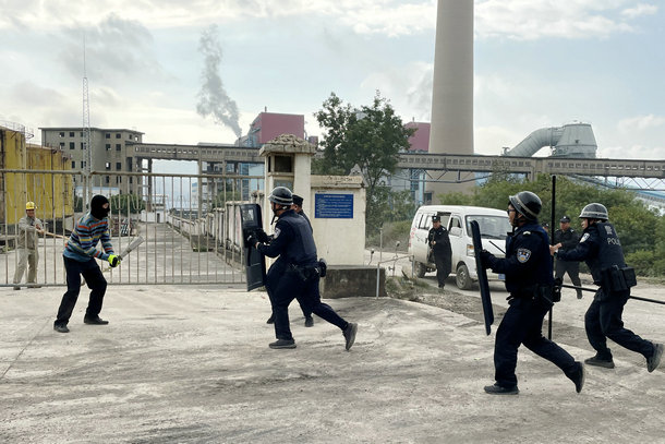 按照演習(xí)方案,兩名“假想嫌疑人”持器械翻越生產(chǎn)區(qū)域3號(hào)門,企圖闖入油泵房破壞生產(chǎn)設(shè)施。生產(chǎn)值班人員發(fā)現(xiàn)歹徒欲行闖入,立即上報(bào),同時(shí)進(jìn)行攔截。該公司應(yīng)急辦迅速啟動(dòng)應(yīng)急預(yù)案,并向公安機(jī)關(guān)報(bào)警,要求出警支援。接到報(bào)警后,鎮(zhèn)派出所快速組織警力趕到事發(fā)現(xiàn)場(chǎng),幾經(jīng)周旋,與公司內(nèi)保人員一起將“恐怖分子”控制抓捕。演練過程中,該公司各個(gè)部門反映迅速,配合默契,采取處置措施及時(shí)、合理、表現(xiàn)出良好的處理突發(fā)事件的能力。