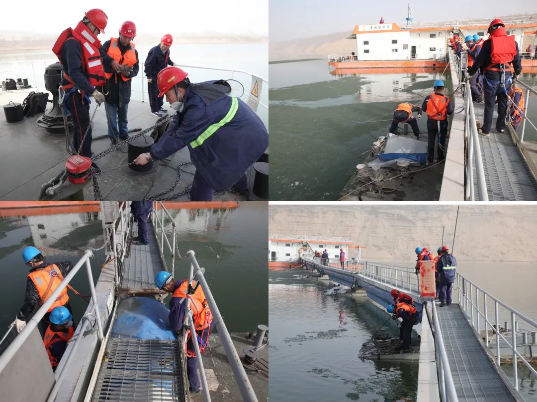 14日上午8時,該公司黨委副書記、總經(jīng)理王學(xué)民帶隊趕赴現(xiàn)場,查看泵船及浮橋受損情況,召開現(xiàn)場緊急會議,制定搶修方案,科學(xué)合理部署各項工作,同時成立搶修組、物資保障組、后勤組,全力確保取水管線搶修與2號機組檢修工作兩不誤。但由于浮橋過道窄,又非地面作業(yè),無法借助外力,局部應(yīng)力無法釋放,只能通過人力牽引錨繩校正浮箱位置;由于浮橋受力側(cè)堆積大量浮冰,搶修人員只能手持破冰利器,一點一點破碎浮冰,給搶修工作帶來了極大挑戰(zhàn)。面對困難,黨員干部敢于亮劍,沖鋒在前,帶領(lǐng)職工群眾奮戰(zhàn)在搶修一線。
