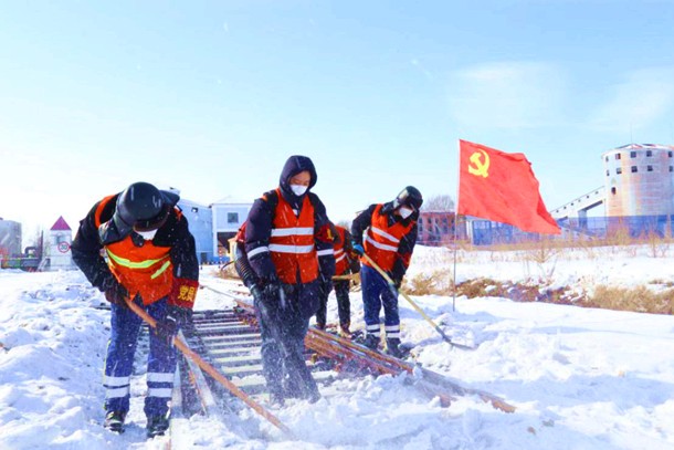 雁寶能源黨員突擊隊(duì)清掃鐵路上的積雪保障外運(yùn)安全
