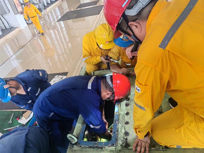 搶修位在汽輪機(jī)前箱內(nèi),操作空間小、技術(shù)要求高,且潤滑油飛濺,油霧和油煙嗆人,環(huán)境惡劣。飛錘拆解時,還出現(xiàn)螺栓咬死難題。面對諸多困難,黨員們毫不退縮,發(fā)揮黨組織的作用,群策群力,決定鉆除舊螺栓重新攻絲,最終解決難題。過程中,萬京親力親為,俯身鉆進(jìn)前箱鉆孔攻絲,其他黨員相互協(xié)作,遞工具、清理打磨零件、制作備用螺栓等。盡管汗水濕透衣裳,無人退縮,展現(xiàn)出高職業(yè)素養(yǎng)和強(qiáng)大團(tuán)隊精神。