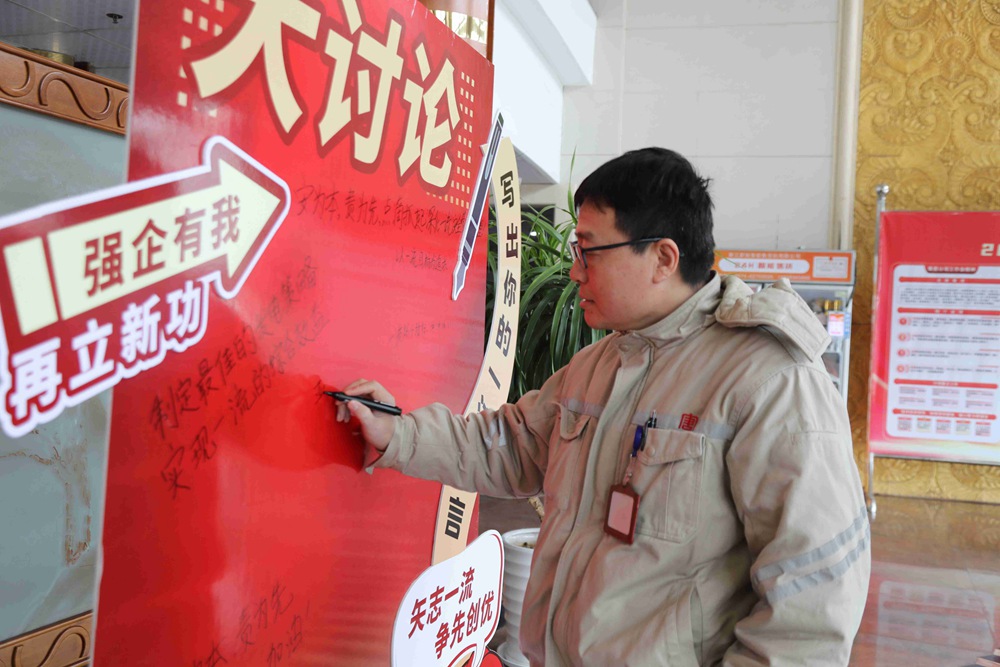 打卡,不僅是對目標的記錄,更是對自我成長的見證;誓言,不僅是對未來的期許,更是對責任的擔當?;顒蝇F場,職工們依次有序地走向留言板,紛紛在展板上“落筆為誓”,一筆一劃地寫出自己的一流誓言,表達著自己誓要“矢志一流爭先創(chuàng)優(yōu) 強企有我再立新功”的堅定決心。“制定最佳的發(fā)電策略,實現一流的綜合效益”“建設一流的供應鏈,筑牢企業(yè)成本優(yōu)勢”“深挖設備潛能,爭創(chuàng)一流能耗水平”“安為本,責為先,點滴抓起深化一流安全管理”……一句句熱血的誓言充盈著整張展板,他們筆下的每一個字都充滿了力量和奮斗的光芒,激勵著每一位職工把承諾深深鐫刻在心里,并轉化為實際行動。