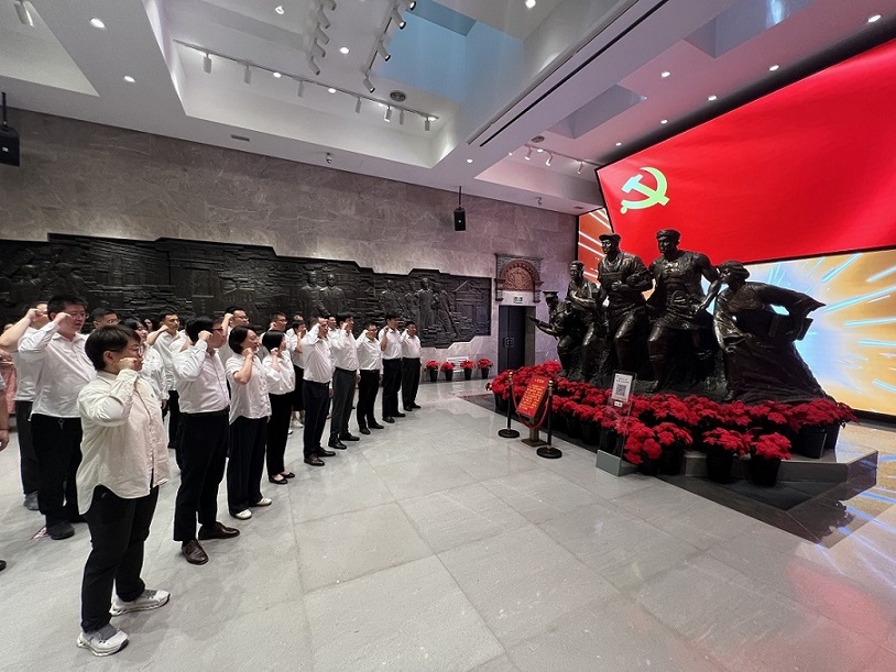 在紀(jì)念館內(nèi),上海公司黨員干部沿著歷史脈絡(luò),通過(guò)多媒體互動(dòng)技術(shù)身臨其境地感受了1925年中共四大召開(kāi)的生動(dòng)場(chǎng)景,一件件珍貴的館藏文物、一幅幅生動(dòng)的歷史圖片、一段段詳實(shí)的文字記錄,全方位展現(xiàn)了中共四大在黨的歷史上的重要意義。在黨旗下,全體黨員佩戴黨徽,舉起右拳,一起重溫入黨誓詞,用發(fā)自內(nèi)心的聲音表達(dá)對(duì)黨的絕對(duì)忠誠(chéng),共同說(shuō)出為共產(chǎn)主義奮斗終身的鏗鏘誓言。