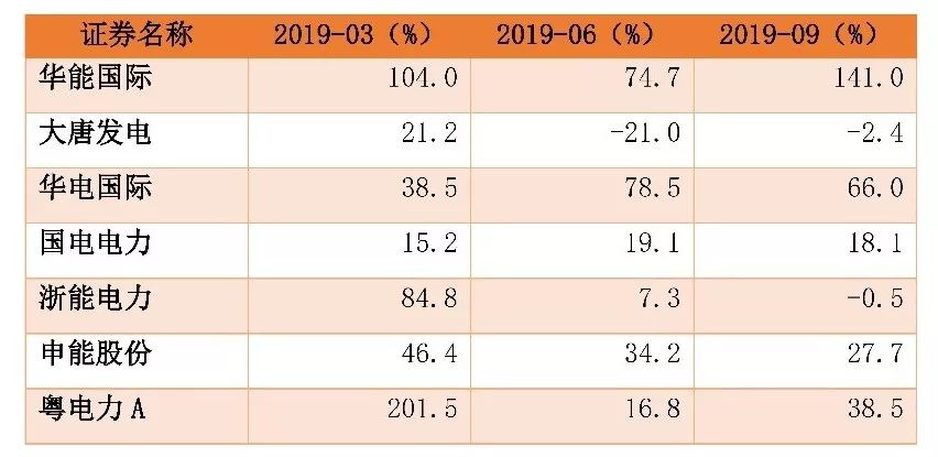 2019 年前三季度華能國際(5.700, 0.03, 0.53%)、華電國際(3.650, 0.01, 0.27%)、國電電力(2.290, -0.01, -0.43%)、大唐發(fā)電(2.420, 0.00, 0.00%)收入增速在0-10%,凈利潤除大唐發(fā)電之外前三季度均保持較高增長。收入增速的變化主要是受到電價(jià)同比提升和發(fā)電量增速回升的影響。