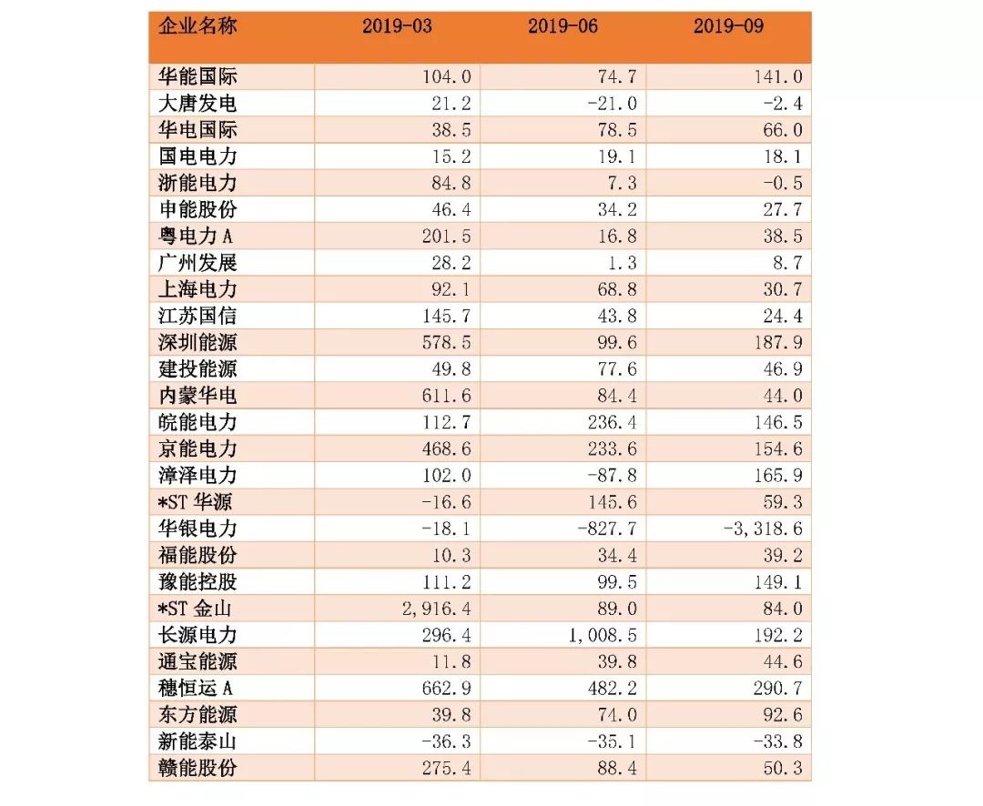 2019年三季度,電力行業(yè)74家上市公司中,實(shí)現(xiàn)歸母凈利潤同比正向增長的有31家,有3家(分別為:漳澤電力(2.380, 0.00, 0.00%)、*ST凱迪(1.050, 0.00, 0.00%)(維權(quán))、太陽能(3.380, -0.01, -0.29%))公司扭虧為盈。