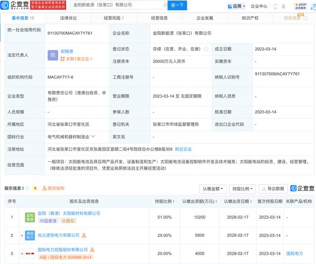 企查查APP顯示,近日,金陽新能源(張家口)有限公司成立,法定代表人為倪錦源,注冊(cè)資本2億元人民幣,經(jīng)營范圍包含:太陽能電池及其應(yīng)用產(chǎn)品開發(fā)、設(shè)備制造和生產(chǎn);太陽能電池設(shè)備控制軟件開發(fā)及技術(shù)服務(wù);太陽能電站的投資、建設(shè)、經(jīng)營管理。企查查股權(quán)穿透顯示,該公司由國投電力等共同持股。