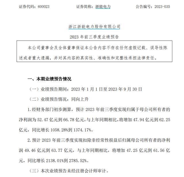 浙能電力稱,經(jīng)財務(wù)部門初步測算,預(yù)計2023年前三季度實現(xiàn)歸屬于母公司所有者的凈利潤為52.47億元到66.78億元,與上年同期相比,將增加47.94億元到62.25億元,同比增長1058.28%到1374.17%。預(yù)計2023年前三季度實現(xiàn)扣除非經(jīng)常性損益后歸屬母公司所有者的凈利潤49.46億元到63.77億元,與上年同期相比,將增加47.25億元到61.56億元,同比增長2138.01%到2785.52%。