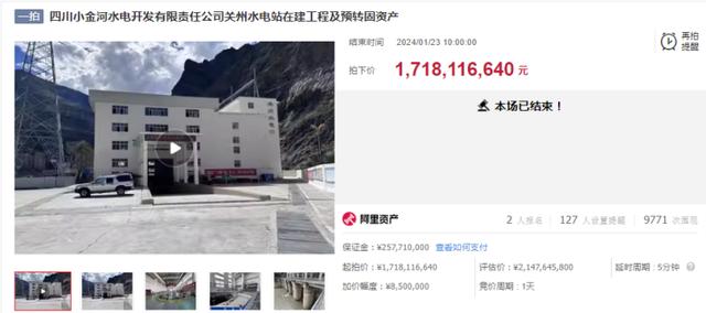 1月22日至1月23日,四川省丹巴縣人民法院在阿里司法拍賣平臺上,對四川小金河水電開發(fā)有限責(zé)任公司(小金河水電公司)關(guān)州水電站在建工程及預(yù)轉(zhuǎn)固資產(chǎn)進(jìn)行公開拍賣,起拍價為17.181億元,較評估價21.476億元打8折,最終以起拍價成交。