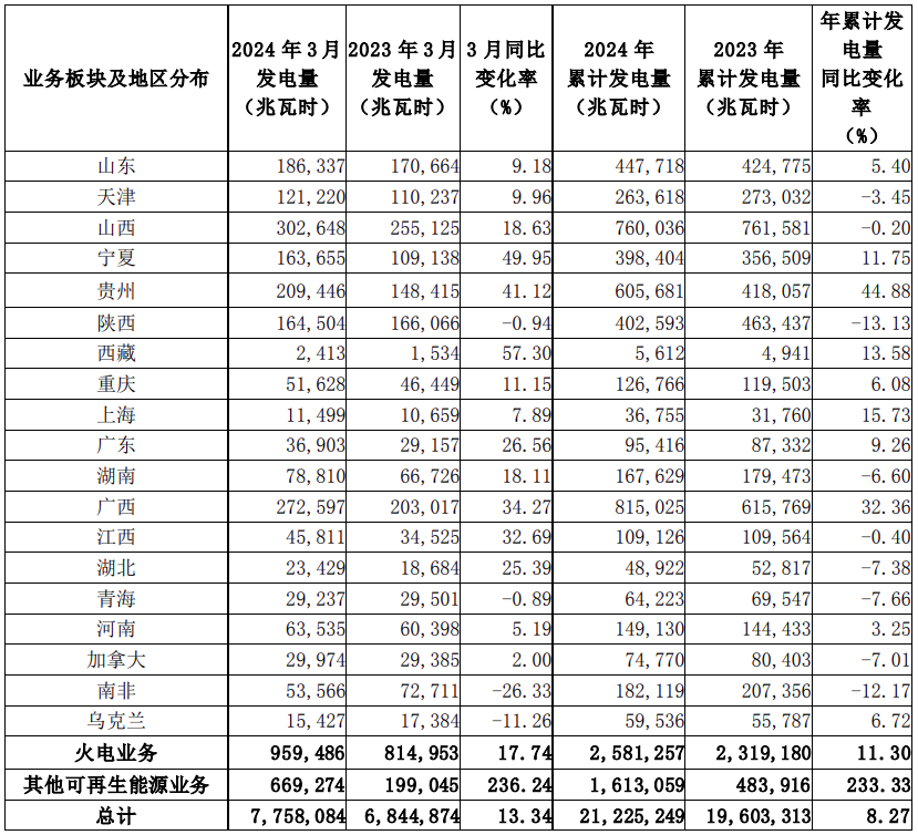 截至2024年3月31日,本公司2024年累計(jì)完成發(fā)電量21,225,249兆瓦時(shí),較2023年同期同比增長8.27%。其中,風(fēng)電發(fā)電量增長1.37%,火電發(fā)電量增長11.30%,其他可再生能源發(fā)電量增長233.33%。2024年3月發(fā)電量詳情如下:
