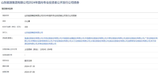 上交所債券項目信息平臺顯示,山東能源集團(tuán)有限公司2024年面向?qū)I(yè)投資者公開發(fā)行公司債券項目,最新的狀態(tài)為“提交注冊”,更新日期為2024年7月30日。
