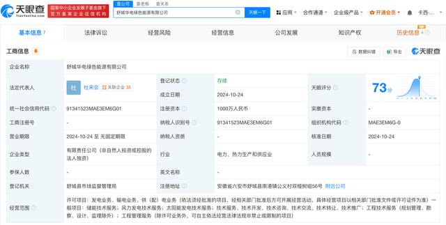 近日,舒城華電綠色能源有限公司成立,法定代表人為杜來會,注冊資本1000萬元人民幣,經(jīng)營范圍含發(fā)電業(yè)務(wù)、輸電業(yè)務(wù)、供(配)電業(yè)務(wù),儲能技術(shù)服務(wù),風(fēng)力發(fā)電技術(shù)服務(wù),太陽能發(fā)電技術(shù)服務(wù)等。股東信息顯示,該公司由華電集團(tuán)旗下華電安徽新能源有限公司全資持股。