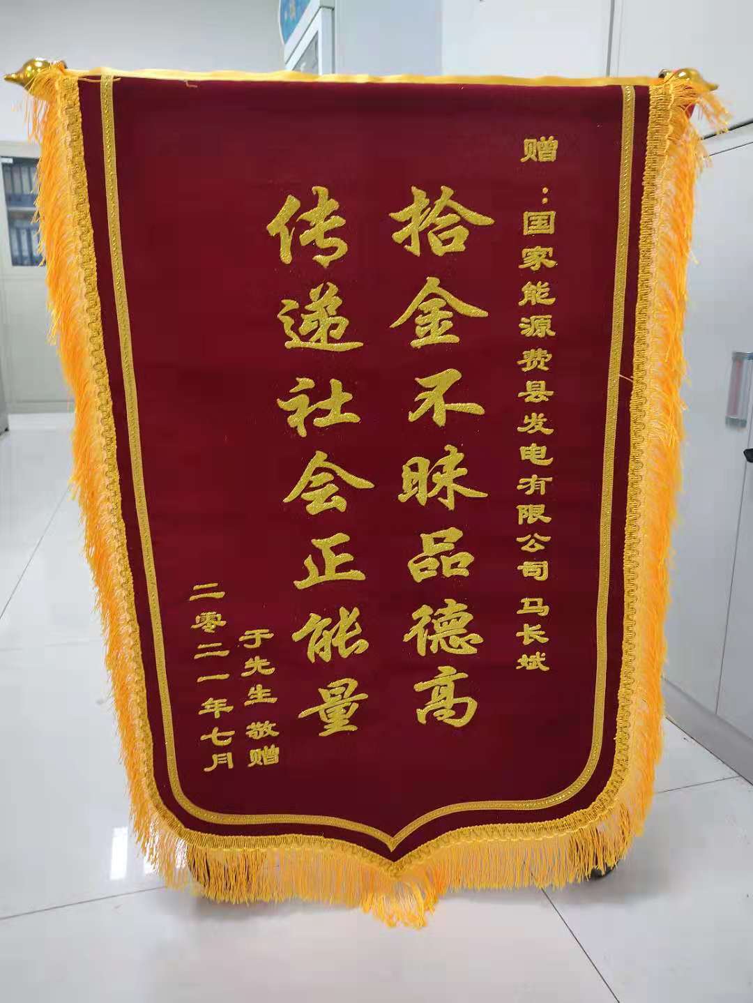 7月26日上午十點(diǎn),費(fèi)縣于先生懷著無(wú)比激動(dòng)的心情將一面錦旗送到公司東門值班室,錦旗上書寫著:“贈(zèng)國(guó)家能源費(fèi)縣發(fā)電有限公司馬長(zhǎng)斌:拾金不昧品德高,傳遞社會(huì)正能量”。