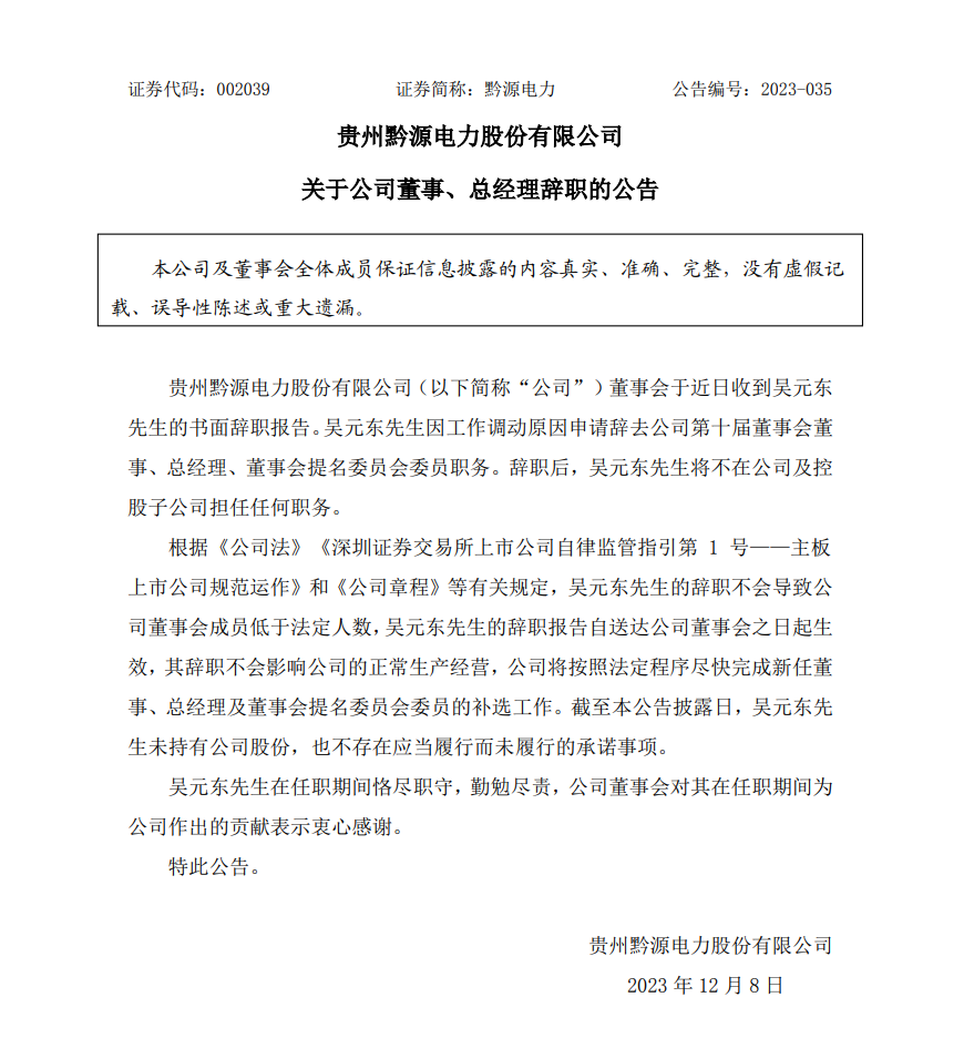 吳元東辭去貴州黔源電力股份有限公司(以下簡(jiǎn)稱“黔源電力”)總經(jīng)理等職務(wù)。