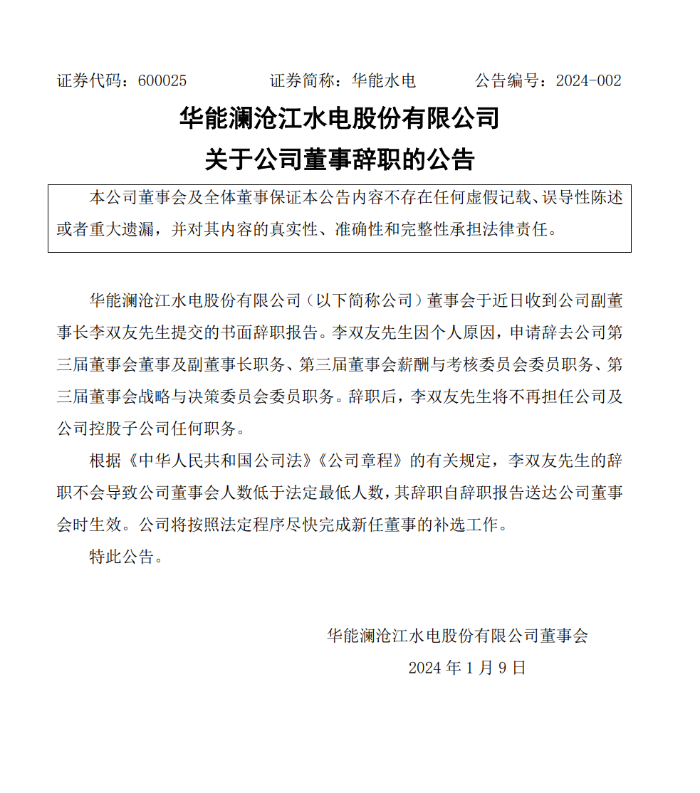 1月9日,華能水電發(fā)布公告稱,公司董事會于近日收到公司副董事長李雙友先生提交的書面辭職報(bào)告。李雙友先生因個人原因,申請辭去公司第三屆董事會董事及副董事長職務(wù)、第三屆董事會薪酬與考核委員會委員職務(wù)、第三屆董事會戰(zhàn)略與決策委員會委員職務(wù)。辭職后,李雙友先生將不再擔(dān)任公司及公司控股子公司任何職務(wù)。