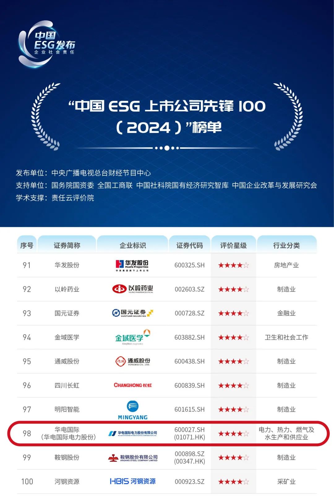 華電國際入選“中國ESG上市公司先鋒100”榜單