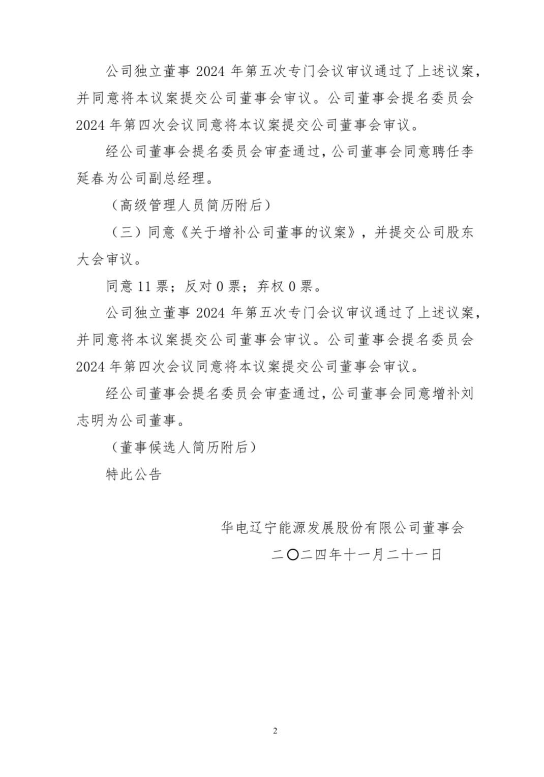 11月21日,華電遼能發(fā)布公告稱,公司于11月20日以現(xiàn)場(chǎng)和通訊方式召開(kāi)了第八屆董事會(huì)第十九次會(huì)議,同意《關(guān)于聘任公司高級(jí)管理人員的議案》經(jīng)公司董事會(huì)提名委員會(huì)審查通過(guò),公司董事會(huì)同意聘任李延春為公司副總經(jīng)理;同意《關(guān)于增補(bǔ)公司董事的議案》,并提交公司股東大會(huì)審議。經(jīng)公司董事會(huì)提名委員會(huì)審查通過(guò),公司董事會(huì)同意增補(bǔ)劉志明為公司董事。