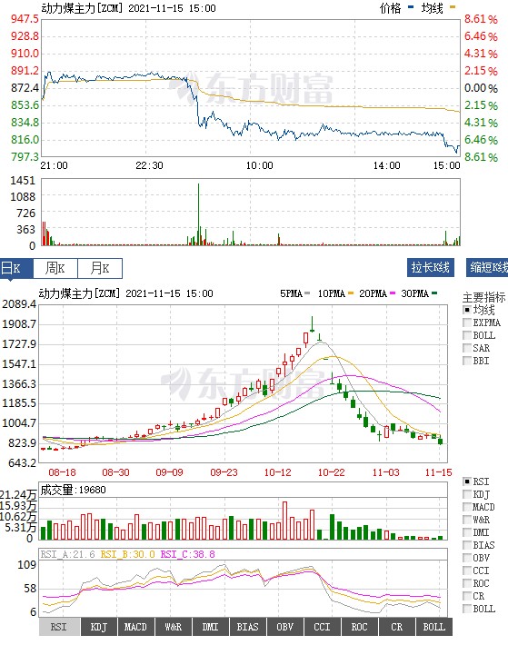 煤炭系期貨集體重挫,截止收盤(pán),動(dòng)力煤跌7.20%,報(bào)809.6元,創(chuàng)8月底以來(lái)新低。