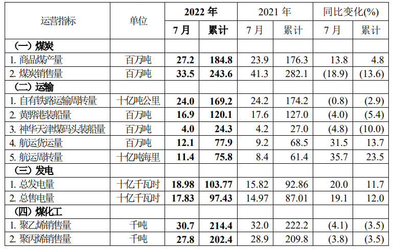 中國(guó)神華發(fā)布2022年7月份主要運(yùn)營(yíng)數(shù)據(jù)。2022年7月,中國(guó)神華總發(fā)電量189.8億千瓦時(shí),同比增長(zhǎng)20.0%;2022年1-7月,中國(guó)神華總發(fā)電量1037.7億千瓦時(shí),同比增長(zhǎng)11.7%。