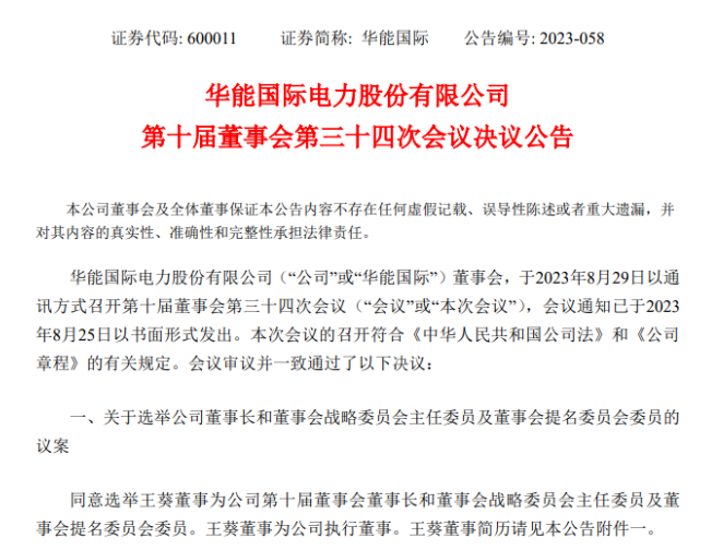 華能國際電力股份有限公司(下稱 " 華能國際 ",600011.SH)發(fā)布公告稱," 現(xiàn)任董事長趙克宇先生因工作需要,于近日依據(jù)有關(guān)規(guī)定向公司董事會提交了書面辭職報告,辭去公司董事長、董事、董事會戰(zhàn)略委員會主任委員、董事會提名委員會委員等相關(guān)職務(wù)。 趙克宇先生的辭職申請,將自公司董事會選舉產(chǎn)生新任董事長之日起生效。"