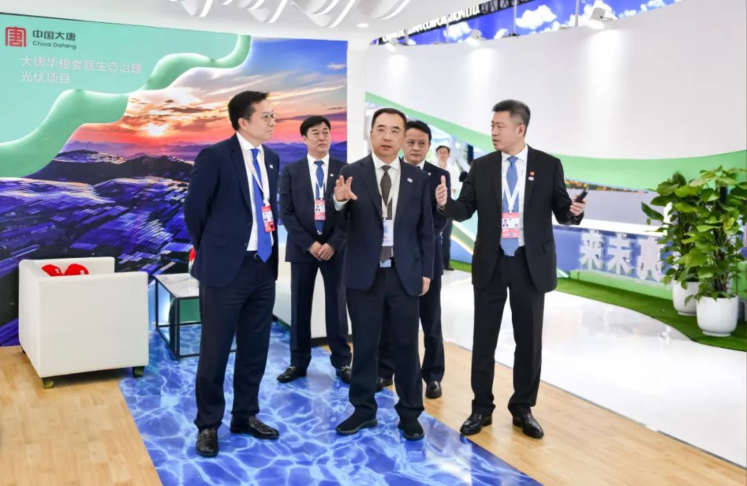 開幕式后,鄒磊、彭勇一行到中國大唐展廳和與中國大唐有深度合作關(guān)系的特電變工、隆基展區(qū)參觀。